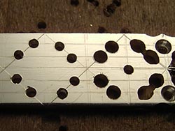けがき線に合わせてドリルを使って空間を作ります。ドリルの刃先を細かく変えて、目的の大きさになるまで丁寧に削ります。 |